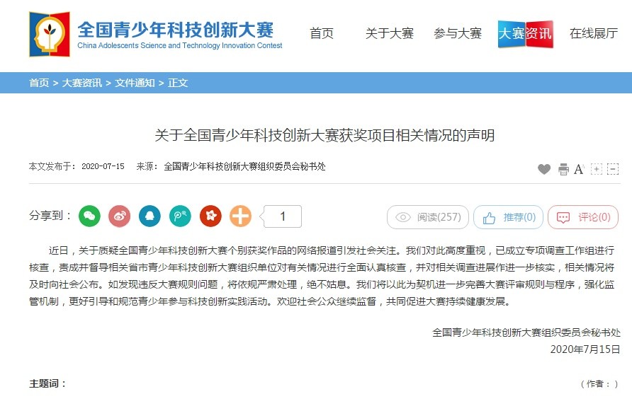 如发现违反大赛规则问题,将依规严肃处理,绝不姑息。我们将以此为契机进一步完善大赛评审规则与程序,强化监管机制,更好引导和规范青少年参与科技创新实践活动。欢迎社会公众继续监督,共同促进大赛持续健康发展。