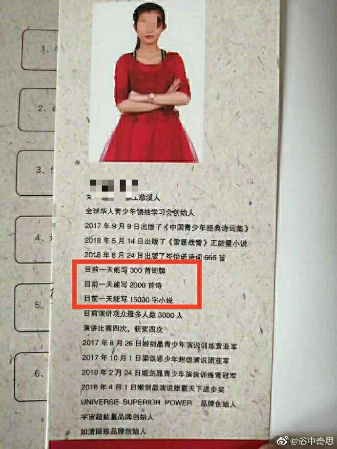 14日开始,一张印有岑某某简介的图片引发关注。号称一天能“作词300首、诗2000首、写15000字小说”、在不到两年的时间内出版3本书,还“参加4次演讲比赛并获奖”。除此之外,岑某某还是品牌创始人,并拥有某“杂志社”记者、地方运营中心副主编等头衔。