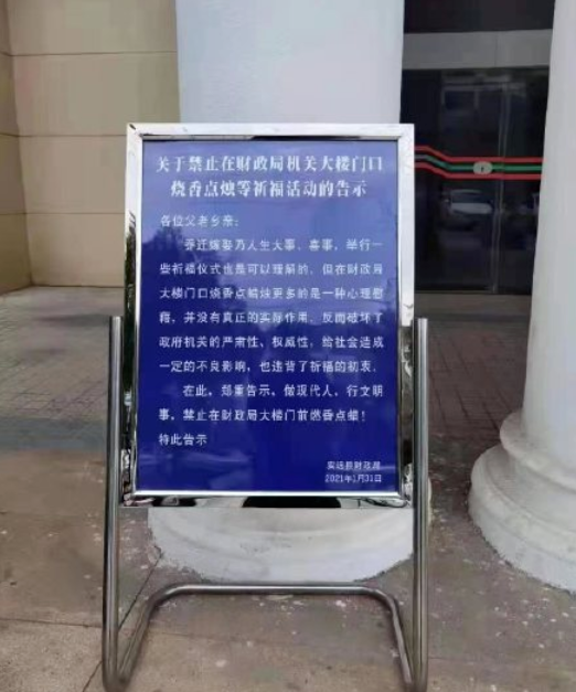 另一张则是该财政局发布的一份告示,蓝底白字直言:做现代人,行文明事,禁止在财政局大楼门前燃香点蜡。