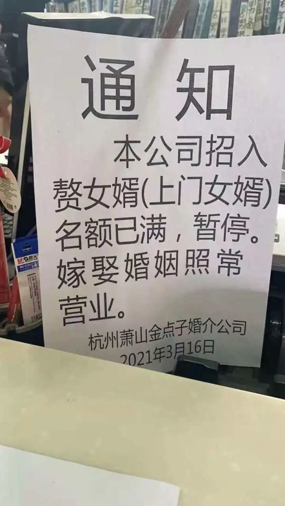 面对接踵而来到访,金点子婚介所有点应接不暇。3月16日,他们不得不在门口立起了一份通知:“招上门女婿名额已满,暂停”。