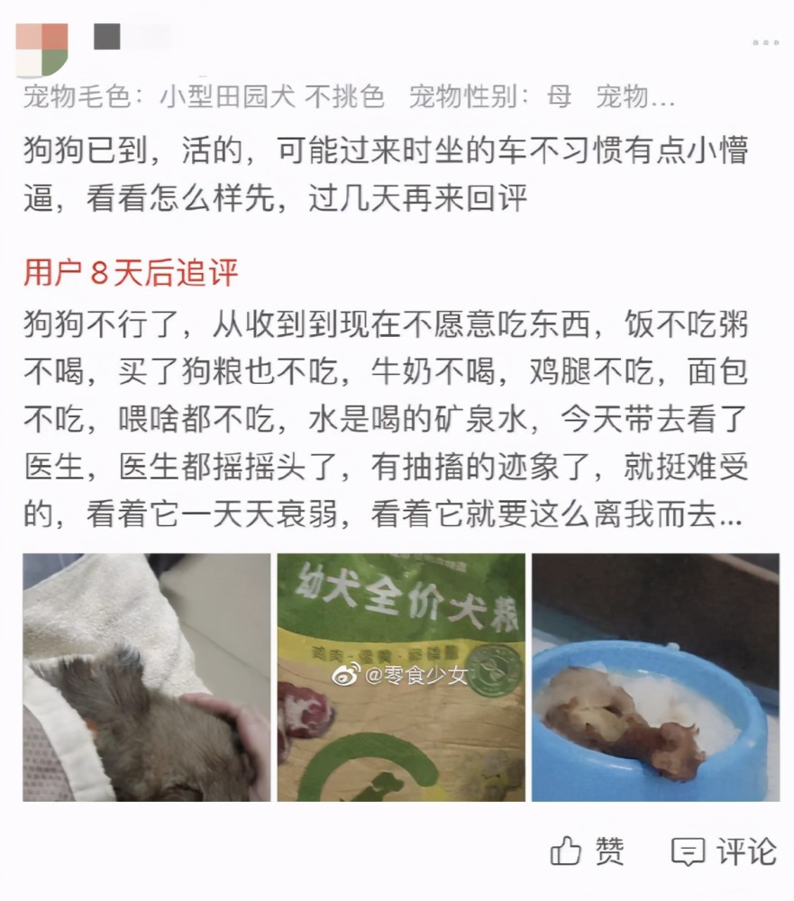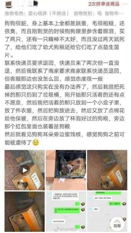 买了狗狗盲盒的网友,在评价里说:狗狗很臭,很脏,精神不好,没办法养。在联系退“货”失败之后,盲盒里的两只小狗,一只死了,另一只被丢弃了。