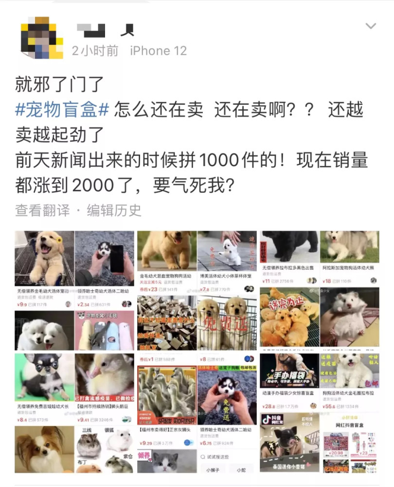 宠物盲盒事情一出,网上声讨声四起,不少网友管宠物盲盒产业链生意是“带血的阴间狂欢”。