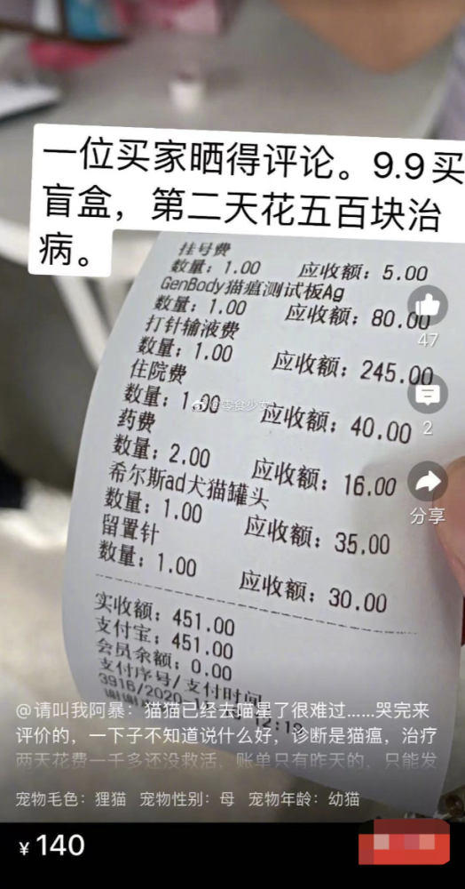 相关盲盒的评论区里,猫狗的尸体,“脏”、“病”、“死”、"退回”是最高频出现的字眼。