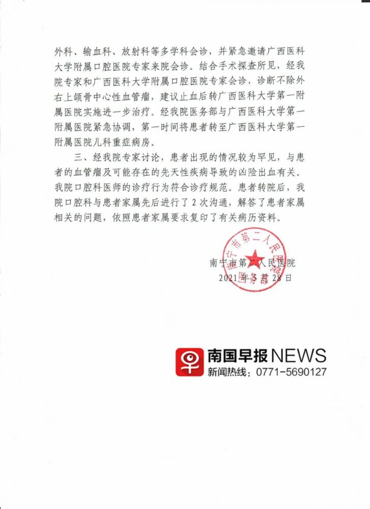 该院称,经我院专家讨论,患者出现的情况较为罕见,与患者的血管瘤及可能存在的先天性疾病导致的凶险出血有关。我院口腔科医师的诊疗行为符合诊疗规范。患者转院后,我院口腔科与患者家属先后进行了2次沟通,解答了患者家属相关的问题,依照患者家属要求复印了有关病历资料。